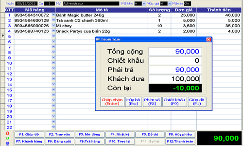 - - Thực hiện bán hàng bằng máy đọc mã vạch, in phiếu, hiển thị tiền thối khi bán lẻ.