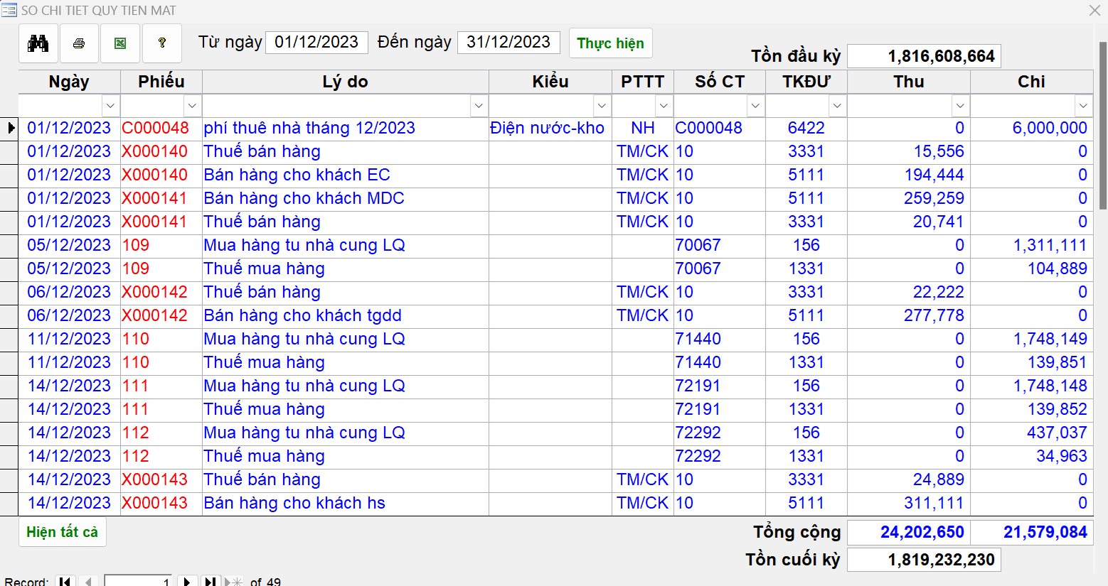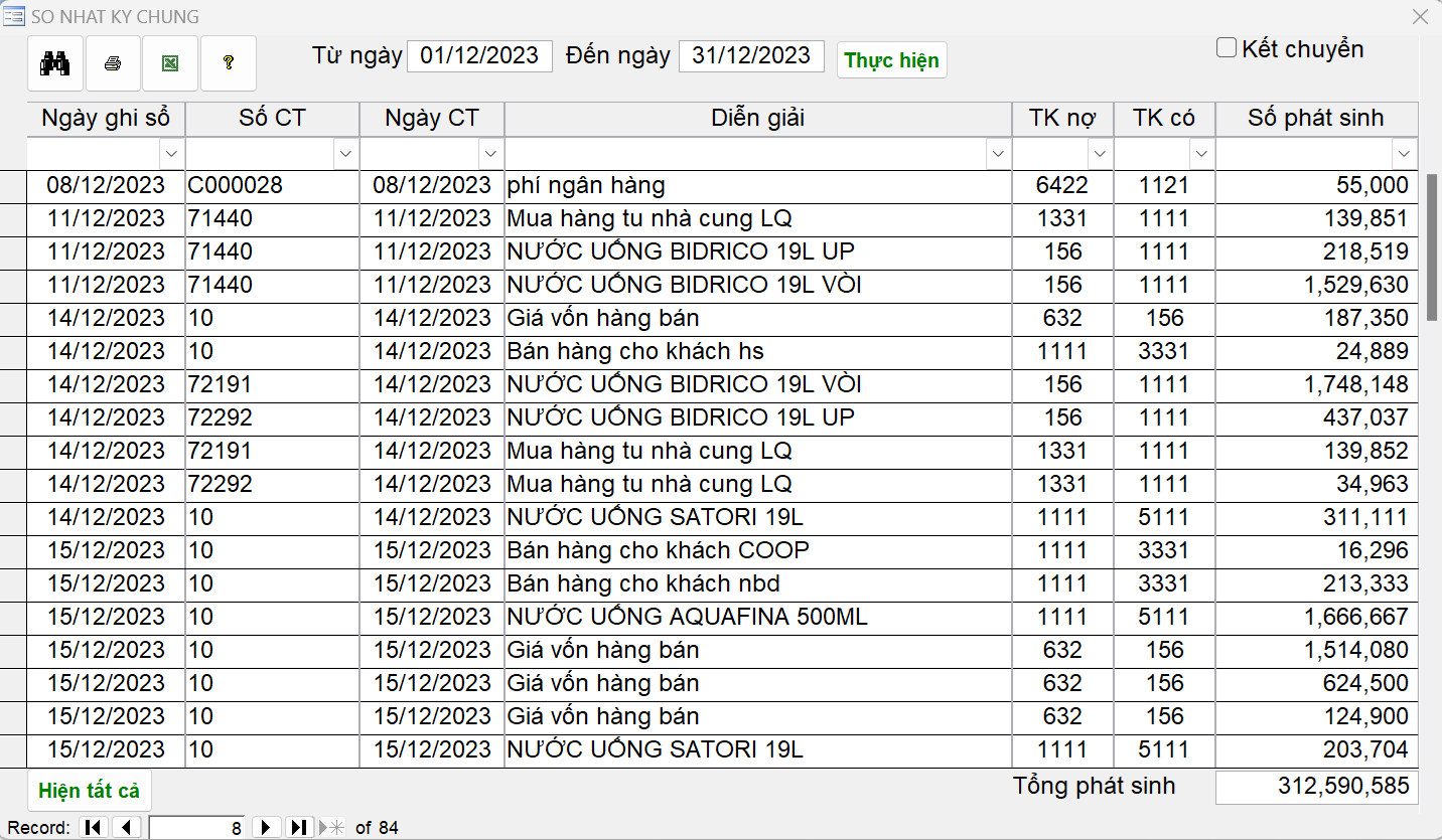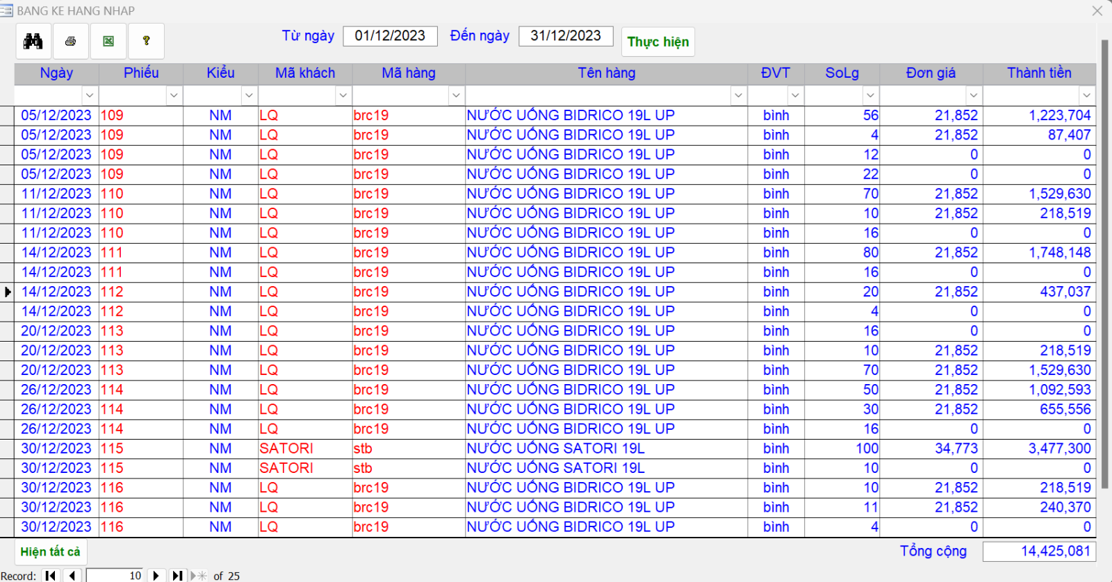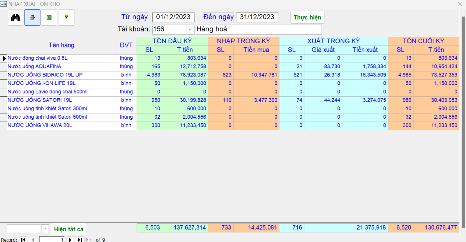 - Thao tác tương tự như bán hàng: các biểu mẫu gồm Bảng kê hoá đơn mua, bảng kê chi tiết nhập hàng, bảng đối chiếu công nợ với nhà cung.