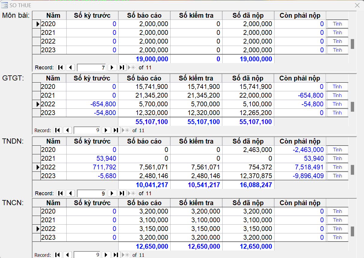 Các khoản thuế đã nộp: hiển thị các khoản thuế đã nộp như Thuế môn bài, Thuế giá trị gia tăng, Thuế thu nhập doanh nghiệp, Thuế thu nhập cá nhân. Qua đó biết được có còn nợ thuế hay không.